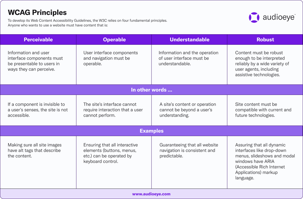 WCAG operates under four principles that inform web design accessibility that ensure content is perceivable, operable, understandable, and robust.