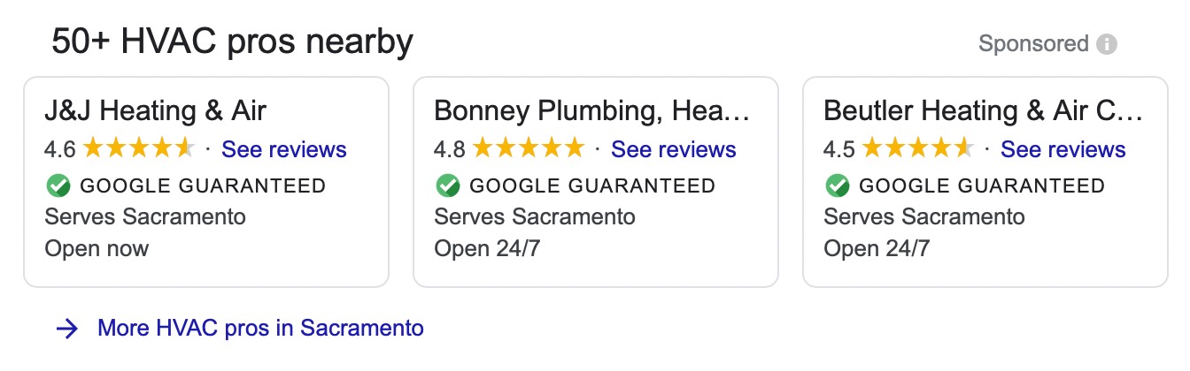 As you can see, Google only displays three LSAs in its search results. To see the others, you'll need to click the blue link that says "More HVAC pros in Sacramento".