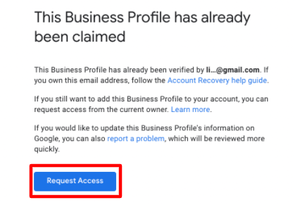 If someone has already created a Google Business Profile for the business, then don’t worry. You can request that management of the profile be handed over to you. Simply click ‘Request Access’ and you’ll be guided through the process.