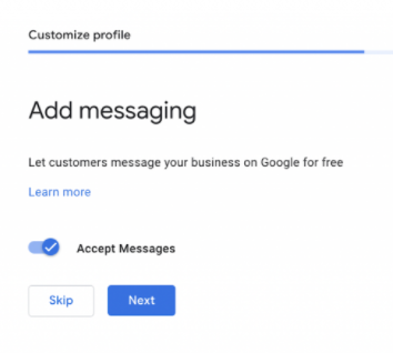 Accepting messages from potential customers within GBP is a great way to connect with your audience and drive sales. However, you should only enable this function if you can commit to managing it consistently. Being unresponsive to messages will create a poor user experience and could harm your business reputation. If you do wish to accept messages, then simply click the button. You can come back and pause or disable this feature at any point.