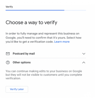 In this step, you’ll be required to choose a verification method to prove the business is operating at the specified address. Receiving a postcard by mail to the business address is the most common route for verification. To make sure the postcard is sent to the right address, you must make sure that only information that is part of the official address is in the listing. You might also have the option to do so via phone call, text message, or email.