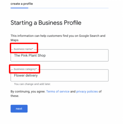 If you’re creating a new profile, then the next step is to add the business name and category. The name that you use here should exactly match the official business name. Don’t be tempted to add any keywords into the name as this violates Google’s guidelines.