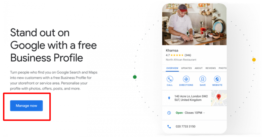Once you have your new email address, head to google.com/business and click ‘Manage now’ to get started: